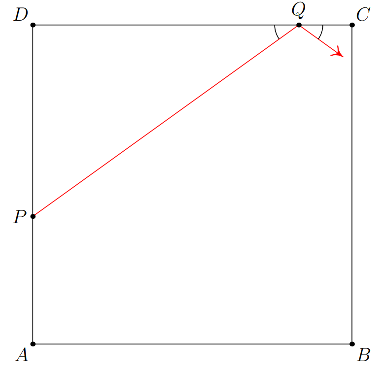 Square ABCD has sides of length 4. Points P and Q lie on \overline{AD} and \overline{CD}, respectively, with AP=\dfrac{8}{5} and DQ=\dfrac{10}{3}. A path begins along the segment from P to Q and continues by reflecting against the sides of ABCD (with congruent incoming and outgoing angles). If the path hits a vertex of the square, it terminates there; otherwise it continues forever. At which vertex does the path terminate?