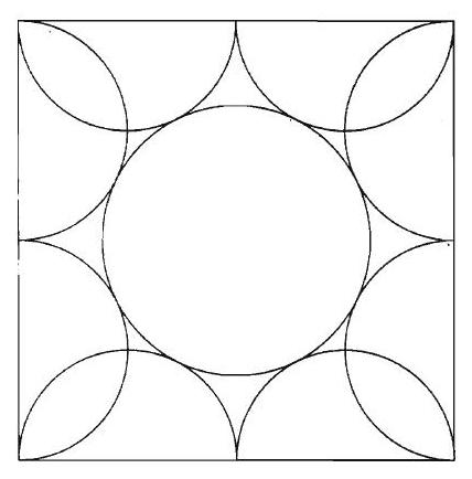 Eight semicircles line the inside of a square with side length 2 as shown. What is the radius of the circle tangent to all of these semicircles?