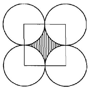 Four circles of radius 3 are arranged as shown. Their centers are the vertices of a square. The area of the shaded region is closest to