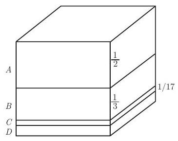 A one-cubic-foot cube is cut into four pieces by three cuts parallel to the top face of the cube. The first cut is \dfrac{1}{2} foot from the top face. The second cut is \dfrac{1}{3} foot below the first cut, and the third cut is \dfrac{1}{17} foot below the second cut. From the top to the bottom the pieces are labeled A, B, C and D. The pieces are then glued together end to end in the order C, B, A, D to make a long solid as shown below. What is the total surface area of this solid in square feet?