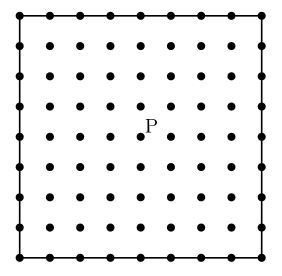 There are 81 grid points (uniformly spaced) in the square shown in the diagram below, including the points on the edges. Point P is in the center of the square. Given that point Q is randomly chosen among the other 80 points, what is the probability that the line PQ is a line of symmetry for the square?