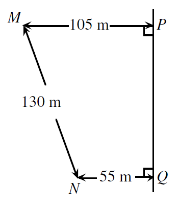 A main gas line runs through P and Q. From some point T on PQ, a supply line runs to a house at point M. A second supply line from T runs to a house at point N. What is the minimum total length of pipe required for the two supply lines?