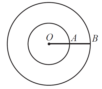 In the diagram, O is the center of each circle. The circumferences of the circles are 24\pi and 14\pi. B is a point on the outer circle and OB intersects the inner circle at A. The length of AB is