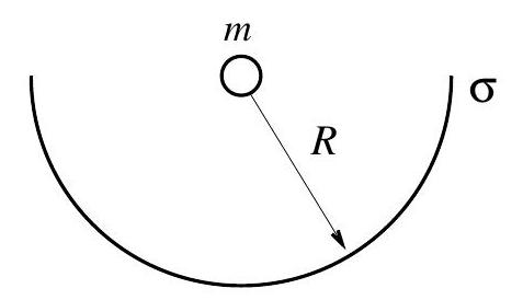 A particle of mass m is placed at the center of a hemispherical shell of radius R and mass density \sigma, where \sigma has dimensions of \mathrm{kg} / \mathrm{m}^{2}. The gravitational force of the shell on the particle is