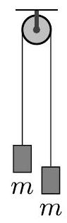 Two equal masses m are connected by an elastic string that acts like an ideal spring with spring constant k and unstretched length l. The two masses are hung over a frictionless pulley. What is the total length of the string at equilibrium? (Diagram not necessarily to scale.)