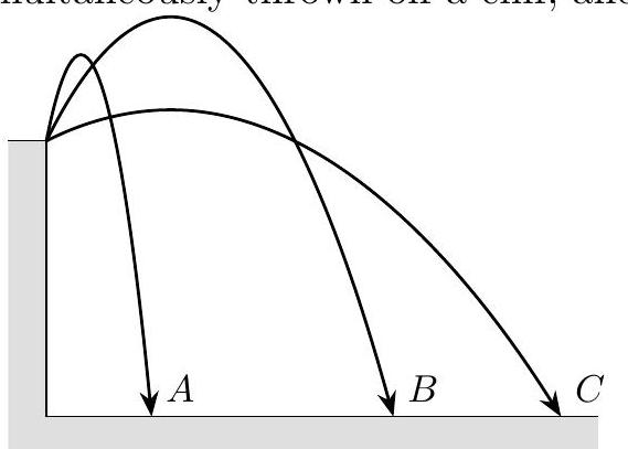 Projectiles A, B, and C are simultaneously thrown off a cliff, and take the trajectories shown.