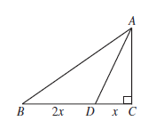 In the diagram, \Delta{ABC} is right-angled at C. If BD=2x,DC=x, and \angle{ADC}=2(\angle{ABC}), then the length of AB is