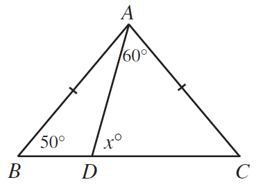 In the diagram, triangle ABC is isosceles, with AB=AC. If \angle{ABC}=50^\circ and \angle{DAC}=60^\circ, the value of x is