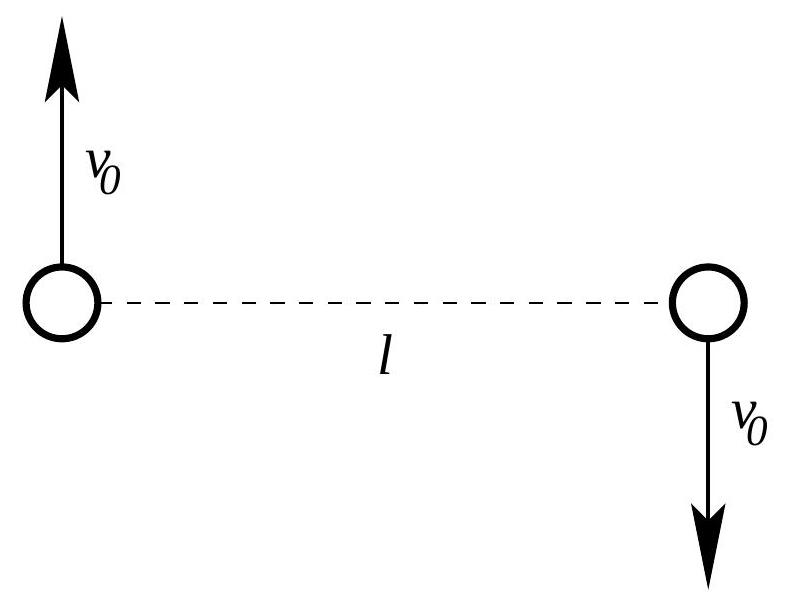 Two masses m separated by a distance l are given initial velocities v_{0} as shown in the diagram. The masses interact only through universal gravitation.